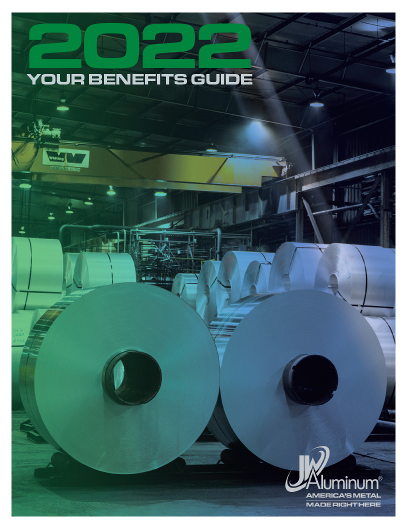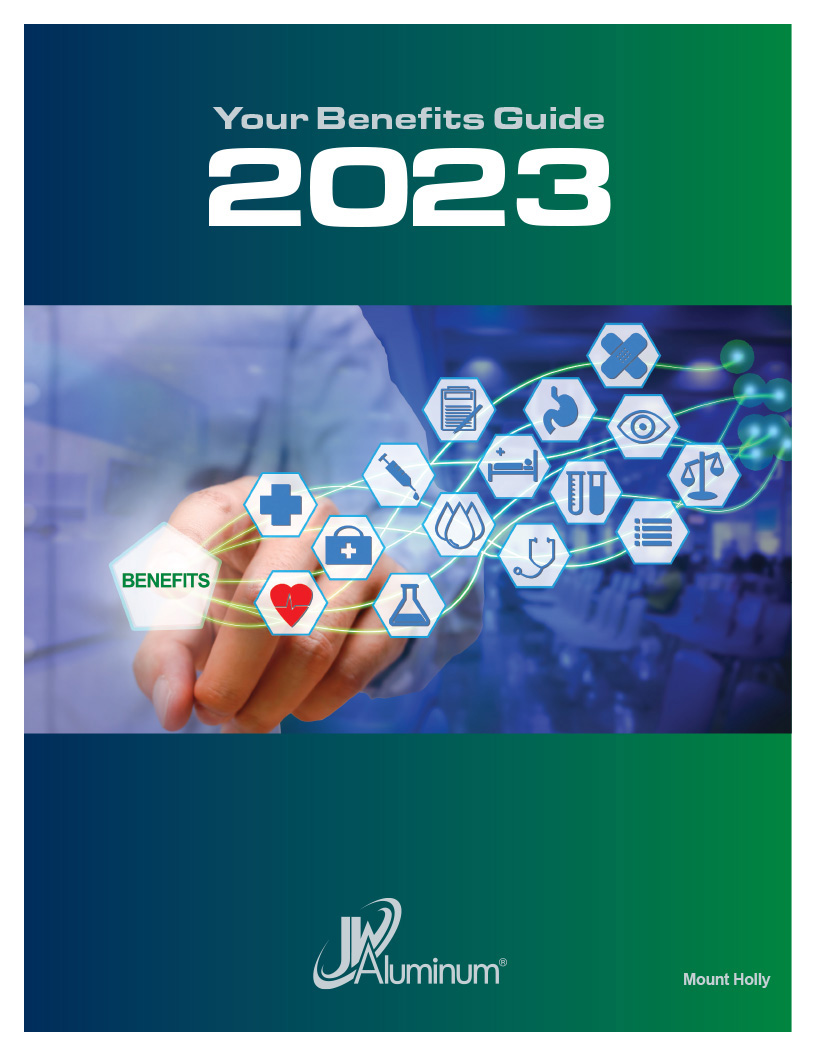 JW Aluminum's 2023 Benefits Guide (cover). 8.5" X 11", four color, non bleed.
