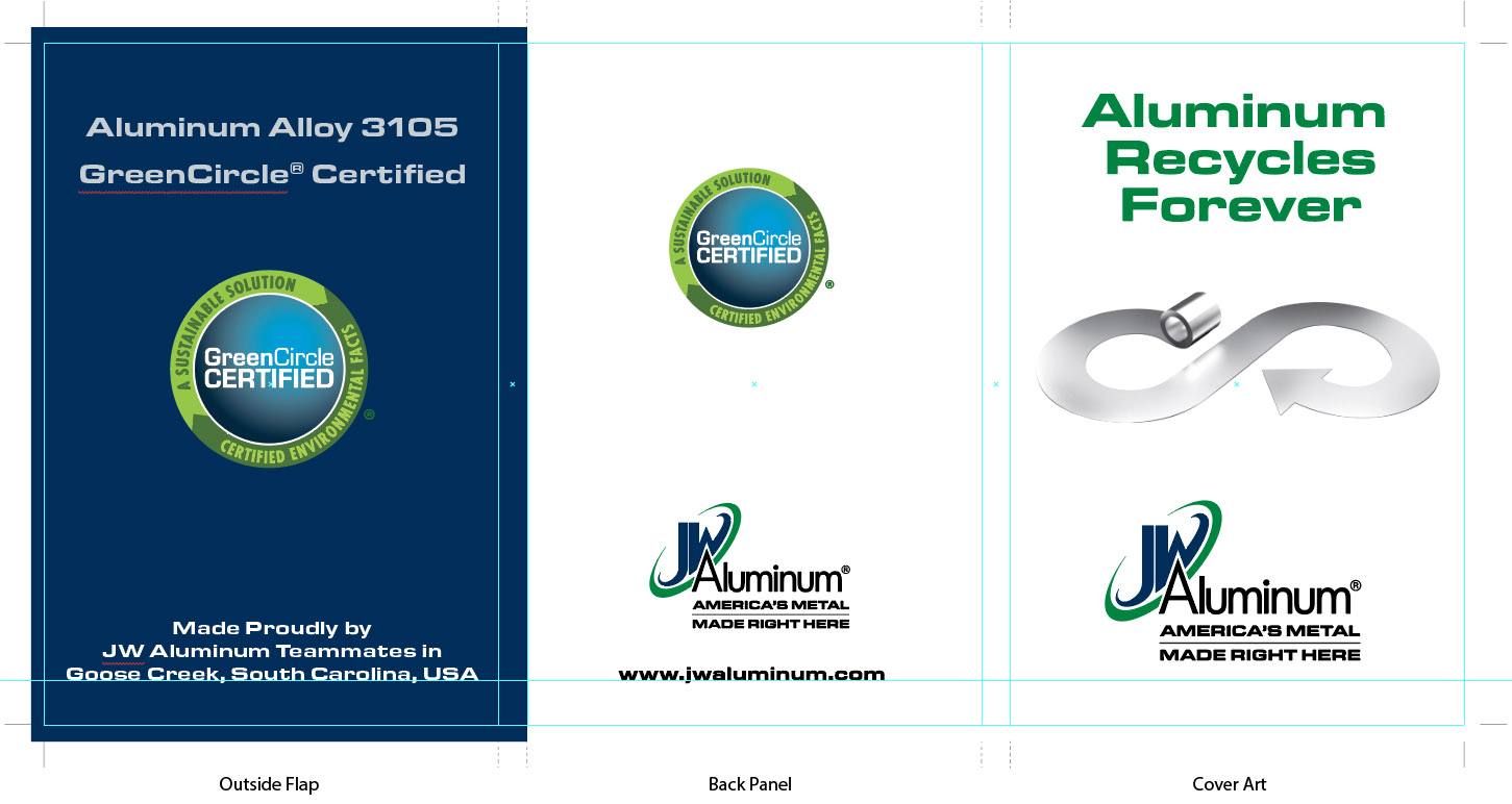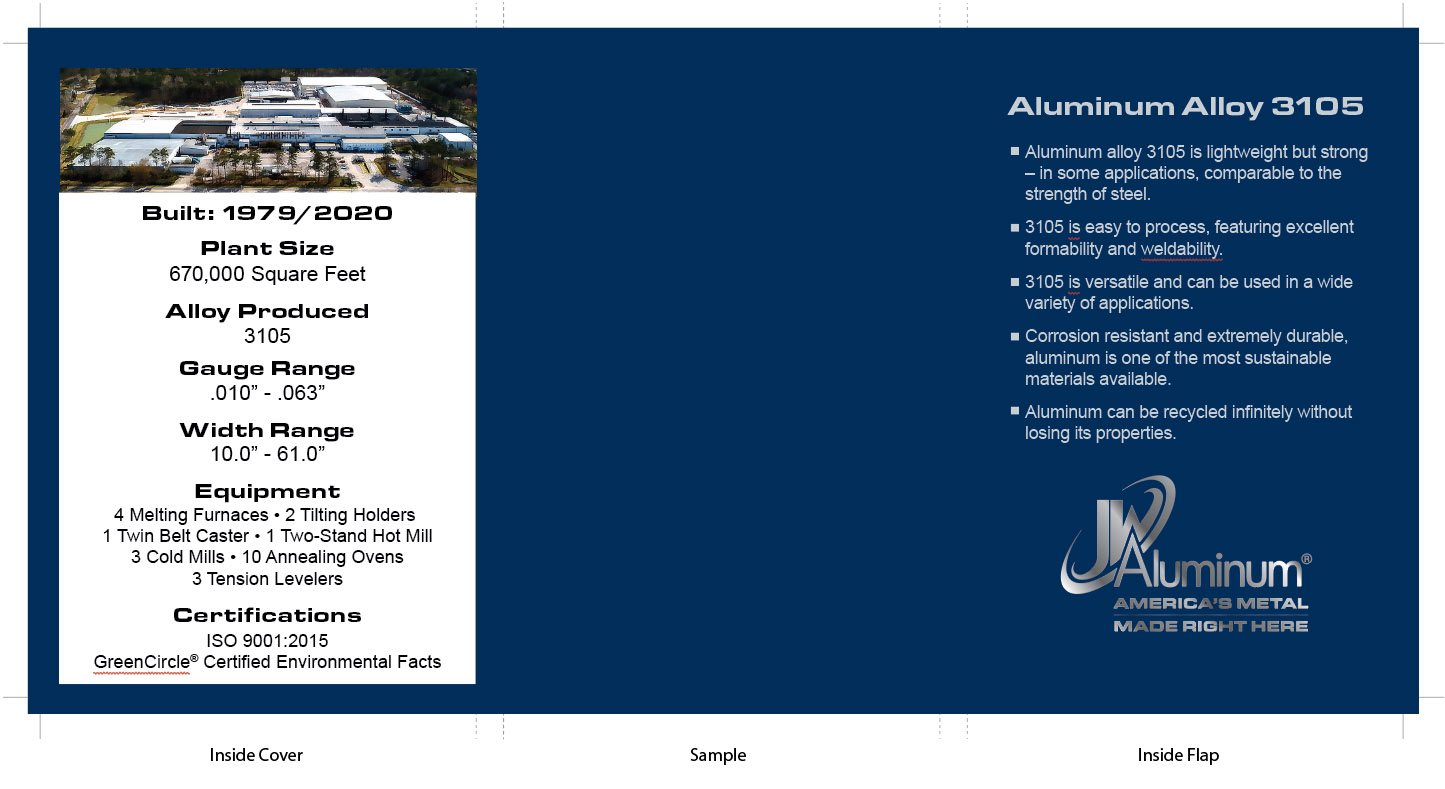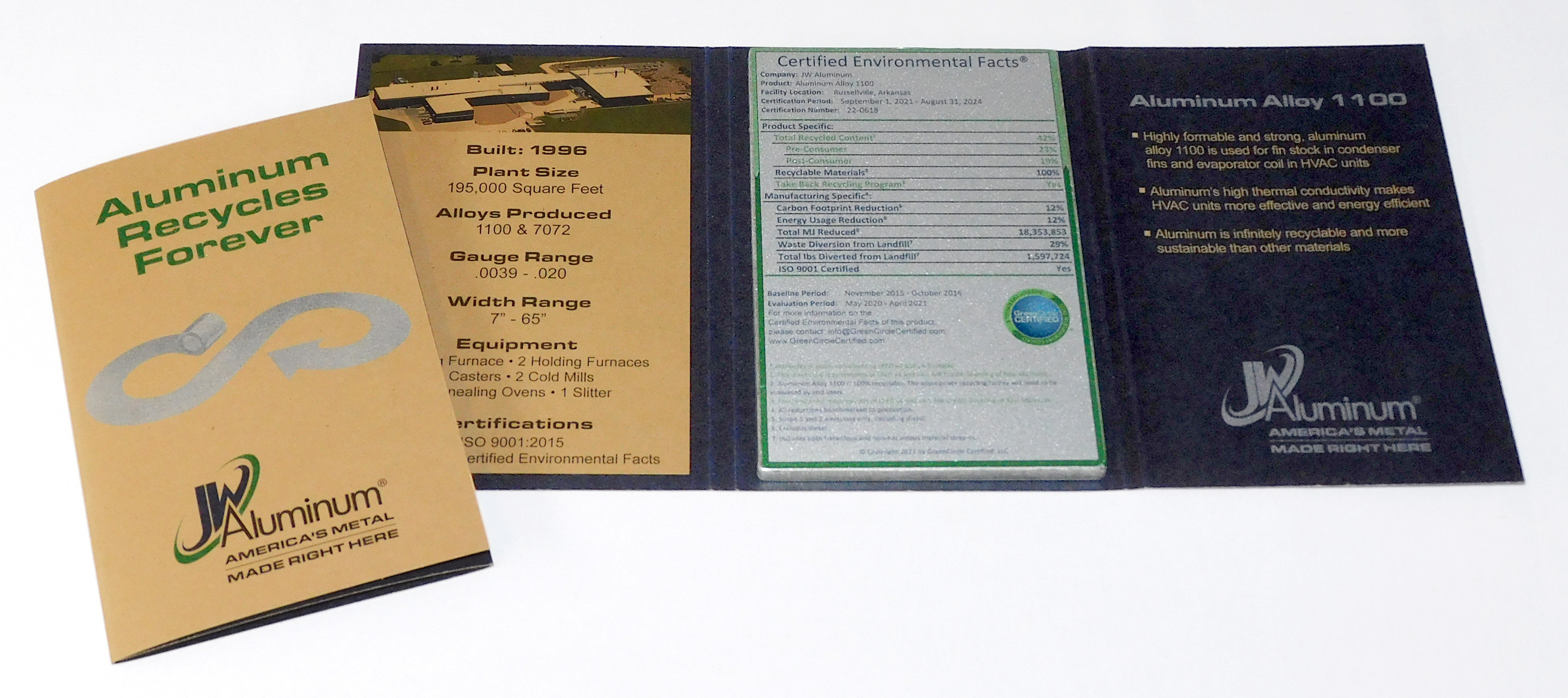 The sample product case for JW Aluminum's Alloy 1100 and 3105 is intended to walk the talk of sustainability. Bypassing the typical plastic option, the card stock is 100% recycled material and, as with aluminum (an actual piece of JW Aluminum included), is 100% recyclable.