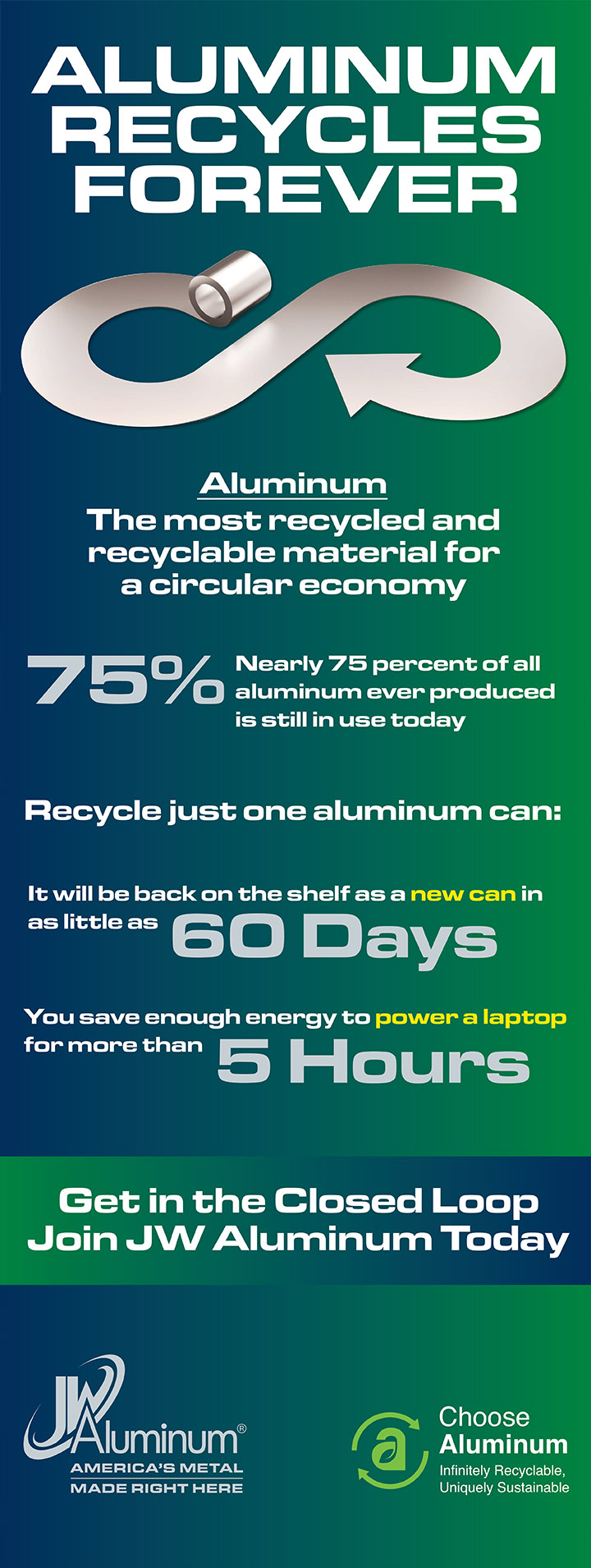 JW Aluminum's job fair banners tout the benefits and advantages aluminum has to offer. Lightweight, sustainable, non-corrosive, easily shaped, yet strong.