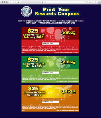 Though the majority of work done for GameWorks has been in the form of HTML emails, there hasn't been any shortage of print work—labels, table tents, coupons, loyalty cards and menus. The list is long. I was also fortunate enough to have created a couple logos for special promotions.